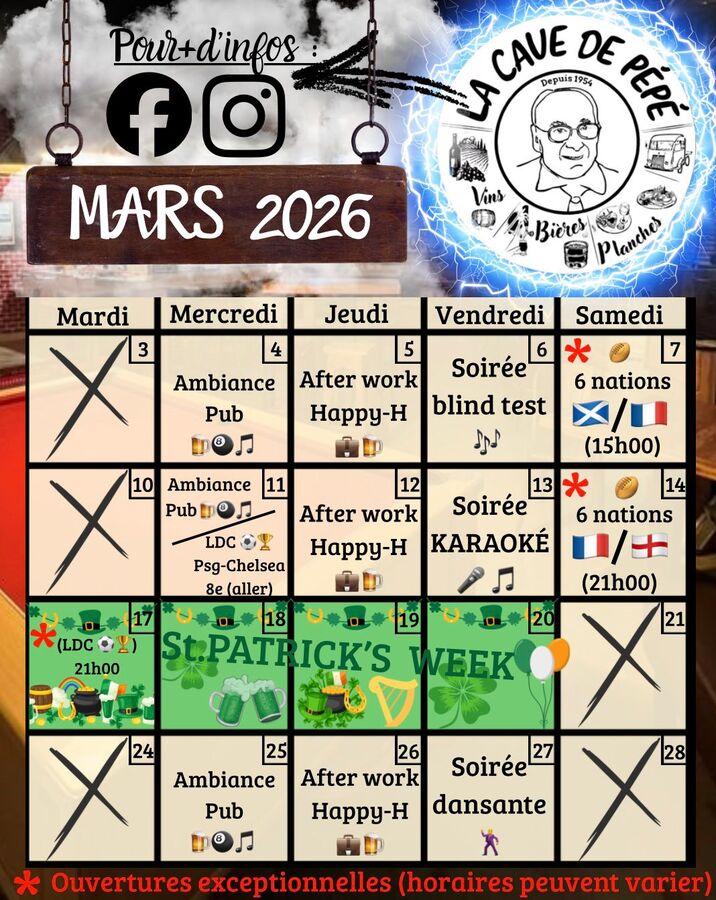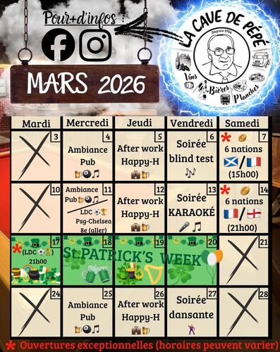 Horaires La Cave de Pépé : mercredi, jeudi, vendredi 18h-minuit